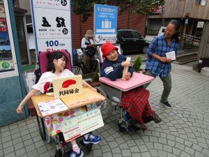 募金活動では、はじめ利用者の2人は緊張した表情で、照れながら職員と声を出していました。
