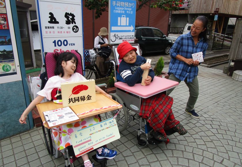 募金活動では、はじめ利用者の2人は緊張した表情で、照れながら職員と声を出していました。