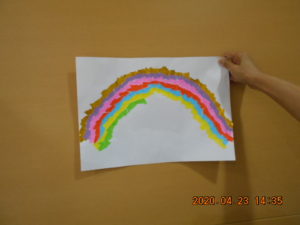 また現在コロナウイルスにより利用者皆さん・職員一同が保護者の皆様、中短期を利用をしていただいている皆様方他大勢の方々に会えなくて寂しい気持ちを抱えており、それはこのブログを読んでいる皆様方も同じだと思います。そんな中第2病棟ではコロナに負けないように切り絵で虹を作っております。