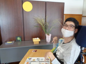 紙粘土で作ったお団子を置いてお月見を体験しました。