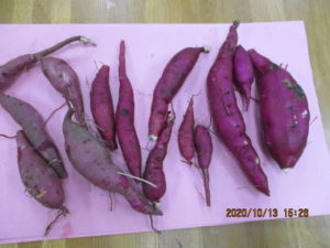 6月に植えた芋の苗。小さい畝を2つ作ったけど、塩害で一つはだめになって、もう一つも葉っぱが元気なくなってしまった。それでも収穫までになんとかつるものびてきた。そして収穫の日。期待はしていなかったけれど、なんと小粒ですが11個芋がとれました。