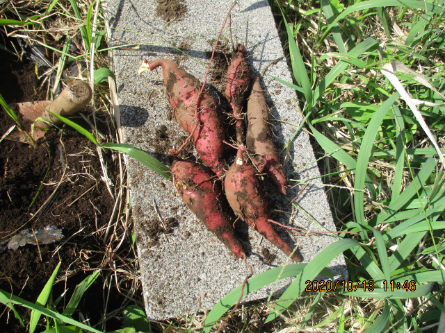6月に植えた芋の苗。小さい畝を2つ作ったけど、塩害で一つはだめになって、もう一つも葉っぱが元気なくなってしまった。それでも収穫までになんとかつるものびてきた。そして収穫の日。期待はしていなかったけれど、なんと小粒ですが11個芋がとれました。