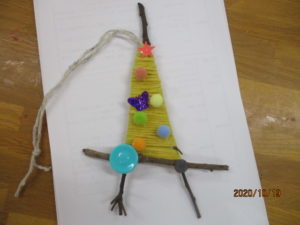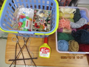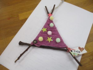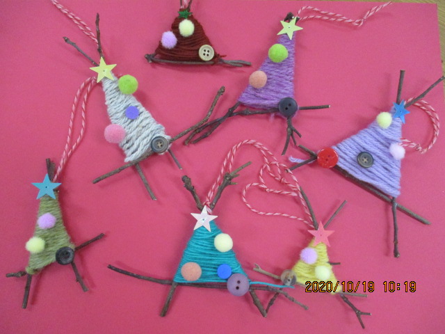 材料は枝で作ったツリー、毛糸、ボンボン、ボタンなどなど。