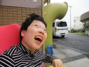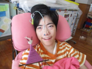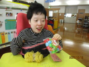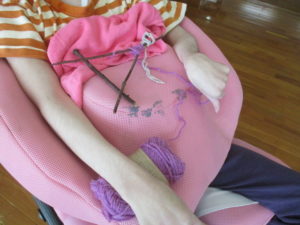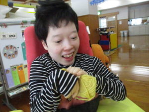 左手で毛糸玉持って、右手で毛糸をからませて・・・