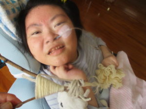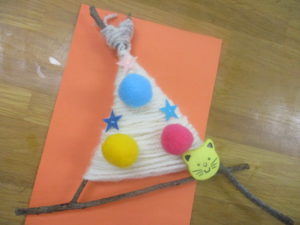 さあ、制作開始。私、白い毛糸にしたの。手でおさえて、木にまいていくの。見てるだけでも面白いわ。