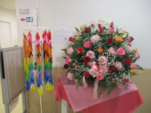 この度、神奈川県花き・植木振興地域協議会様、神奈川県生花小売協同組合鎌倉支部様より、フラワーアレンジメントを頂きました。また明日の鎌倉をつくる会より、千羽鶴を頂きました。