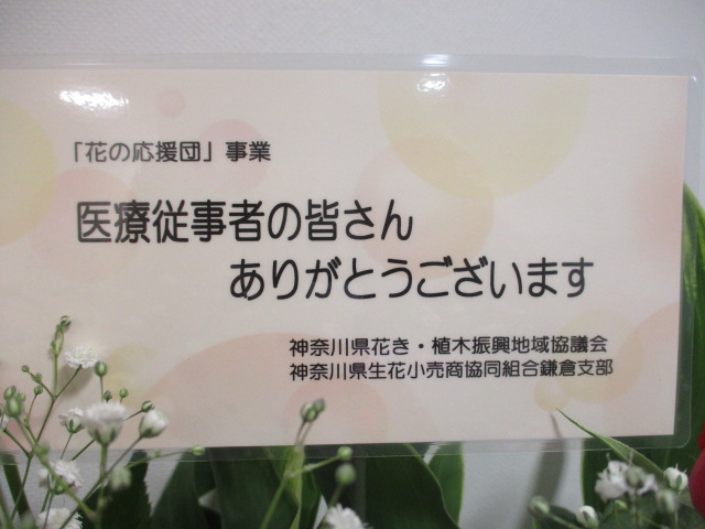 この度、神奈川県花き・植木振興地域協議会様、神奈川県生花小売協同組合鎌倉支部様より、フラワーアレンジメントを頂きました。また明日の鎌倉をつくる会より、千羽鶴を頂きました。