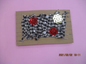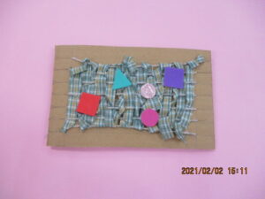 段ボール織機。僕たち、引っ張て糸通したよ。