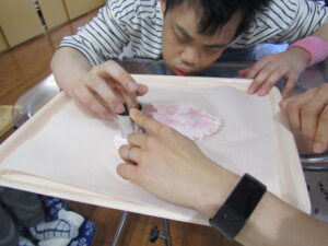 今日は男子が集まって石鹸作り。石鹸の材料を混ぜて、もみもみ。次はアロマオイル入れてもみもみ。食紅入れてもみもみ。丸く丸めて、のし棒でのばしてのばして。桜の型で型抜きして出来上がり!かわいい袋に入れてホワイトデーに女子に渡します。