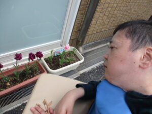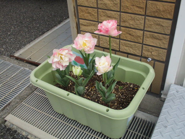 12月に植えたチューリップ。普通のチューリップと違って花びらが多く、花びらの周りがふりふりになっています。