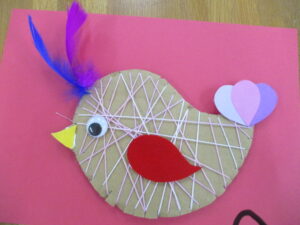 鳥の製作。糸を選んでまいてまいて、尾、羽、冠をつけます。