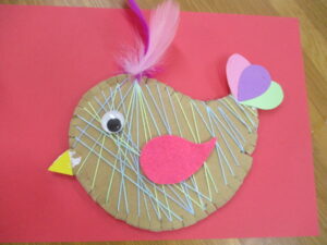 鳥の製作。糸を選んでまいてまいて、尾、羽、冠をつけます。
