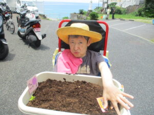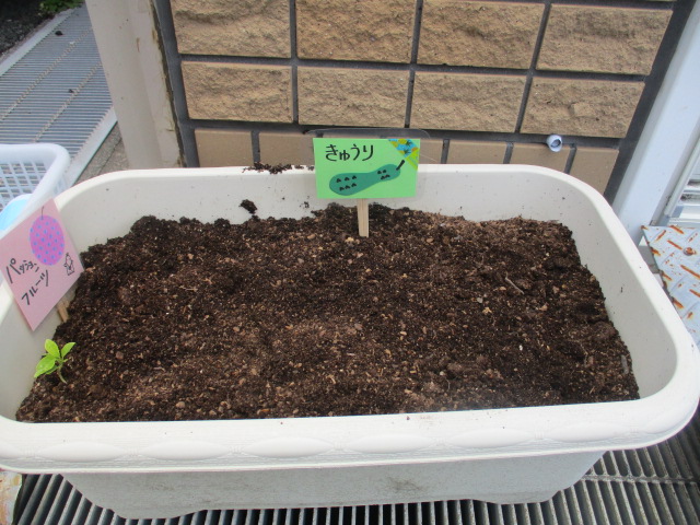 せっかく、芽が出たミニカボチャは塩害で全滅、残念です。もう1回チャレンジできゅうりの種をまきました。