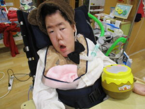 利用者様それぞれ動物に扮して椅子に食べ物を置いていきます。 かわいい動物姿にため息がもれます。
