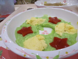 そして昼食はクリスマスメニュー! クリスマスリースの形でこちらも彩り豊かです。
