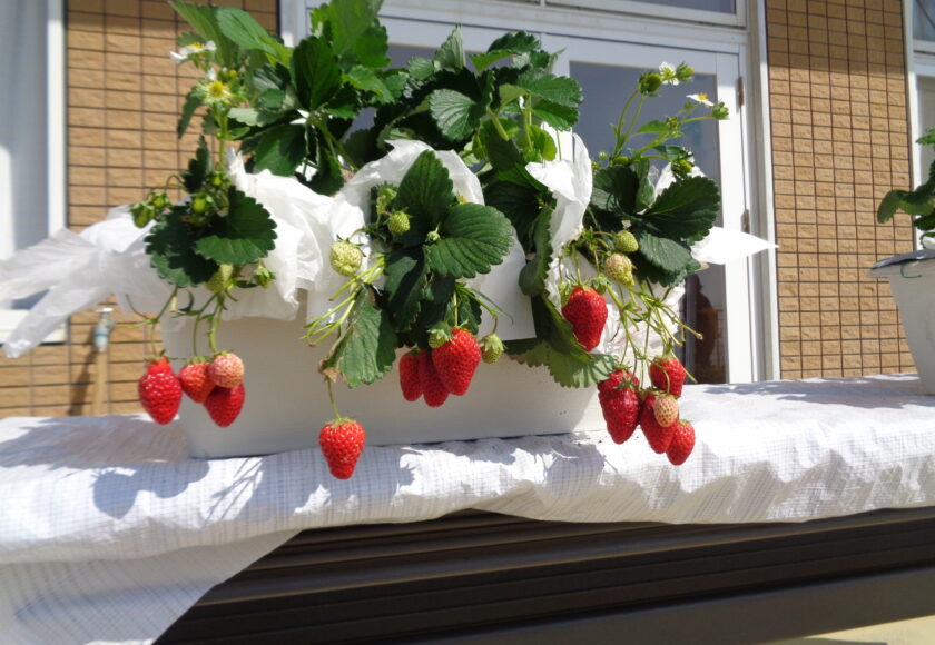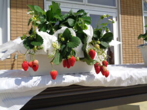 膨らませ今日はテラスでいちご狩りをしました。