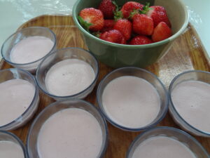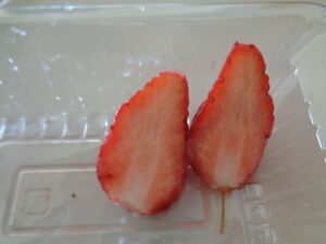 とれたての朝どれいちごを栄養士さんに依頼しお昼のデザート『いちごミルクカン』を作ってもらいました。