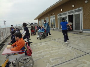 火災の放送に緊張しながらも自走出来る利用者は職員と一緒に落ち着いて移動しました。