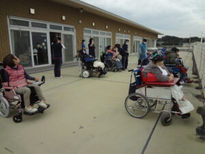 火災の放送に緊張しながらも自走出来る利用者は職員と一緒に落ち着いて移動しました。