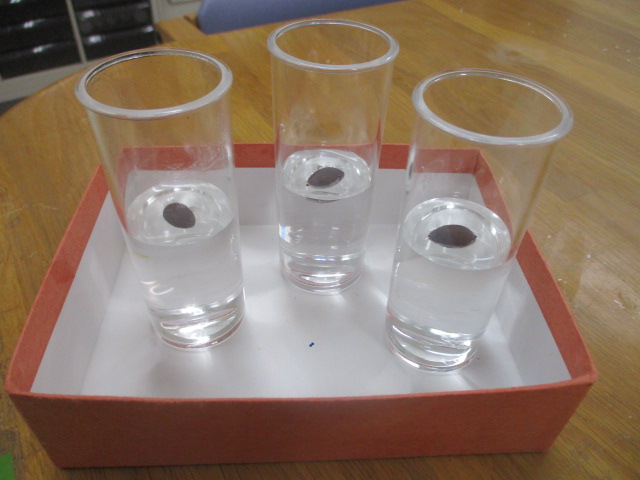 そして、水の入ったコップに入れて、芽が出るまで待ちます。
