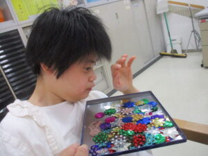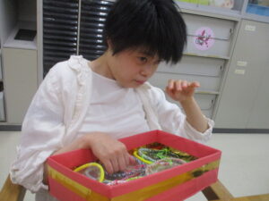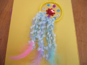 ドリームキャッチャー作り。材料を触って、音や感触を楽しみました。