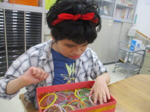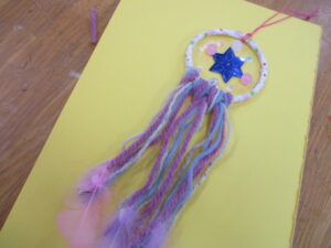 ドリームキャッチャー作り。材料を触って、音や感触を楽しみました。