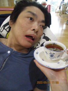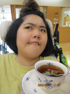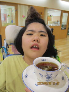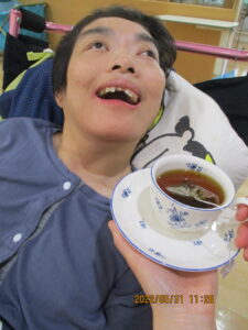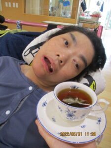 紅茶を近付けると・・・顔を向けて目を向けます。眉を上げて顔を上げて・・・香りを確かめて数十秒、こんなに表情の変化が見られました。その後も笑顔が時折見られ、初回の紅茶活動は大成功でした。