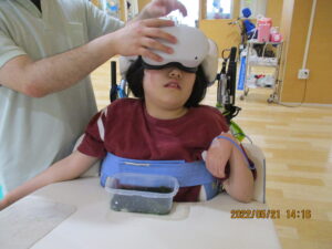 第二病棟では、利用者様の五感を刺激する療育活動の一環として、巷でも大人気のニンテンドースイッチと、本格的な疑似体験が出来るVRゴーグルを活用しています。