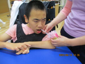 いちご狩りでは、一人ひとりの姿勢や手の可動域に合わせ、布やネットになっている苺を上手に摘んでいきます。 思いの外すんなり外れてくれない苺に苦戦される姿もありましたが、皆さま諦めずに挑戦されていました!